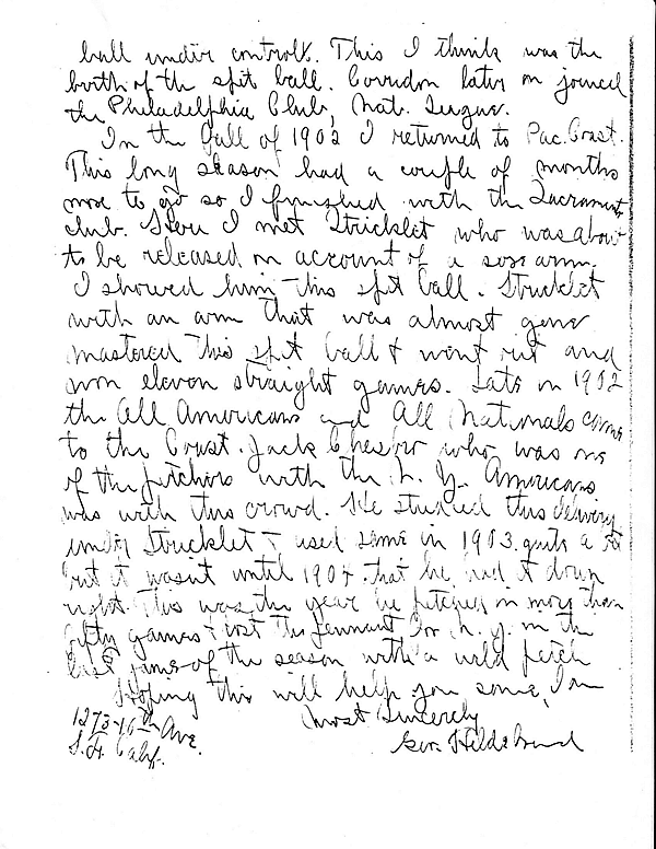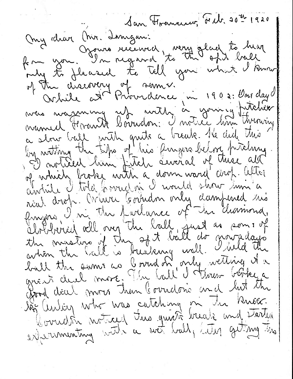 "Yours received, very glad to hear from you. In regard to the spit ball only to pleased to tell you what I know of the discovery of same."